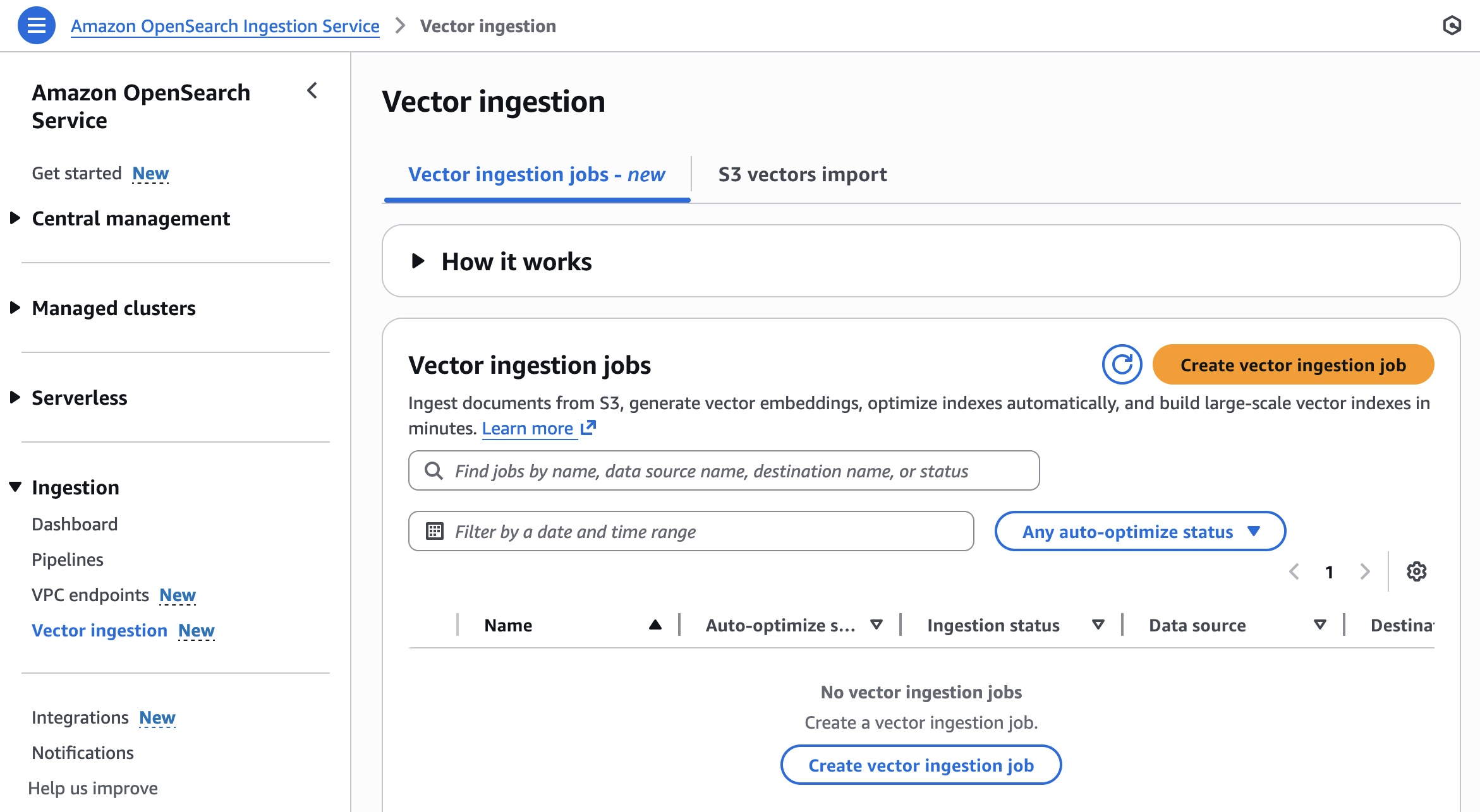 開始するには、OpenSearch Service コンソールの左側のナビゲーションペインにある Ingestion メニューの下の Vector ingestion を選択します。