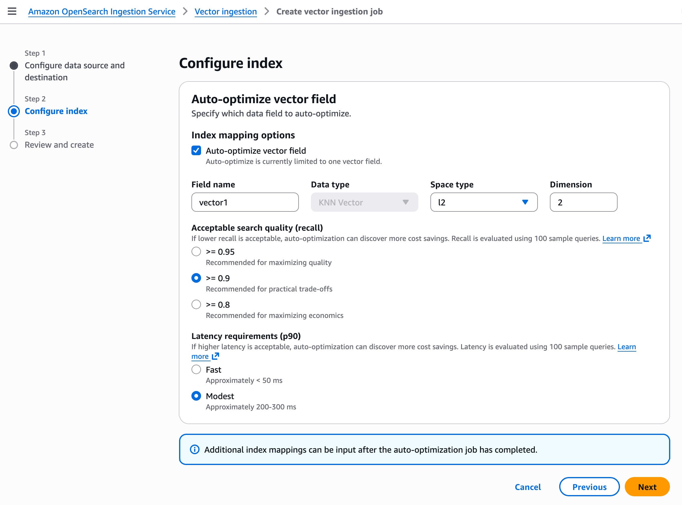 ステップ 2 では、自動最適化ベクトルフィールドを使用してベクトルインデックスを設定します。自動最適化は現在、1 つのベクトルフィールドに制限されています。自動最適化ジョブが完了した後に、追加のインデックスマッピングを入力できます。