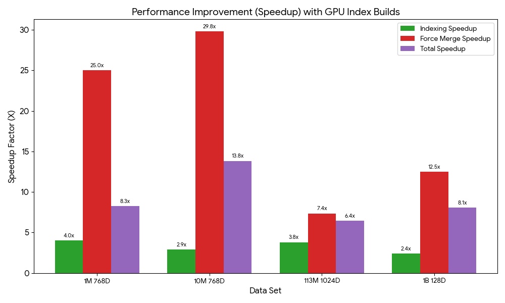 インデックス構築のベンチマークを実行したところ、GPU アクセラレーションによる速度向上は 6.4 倍から 13.8 倍の範囲でした。今後の投稿で、さらなるベンチマークと詳細をお届けする予定です。