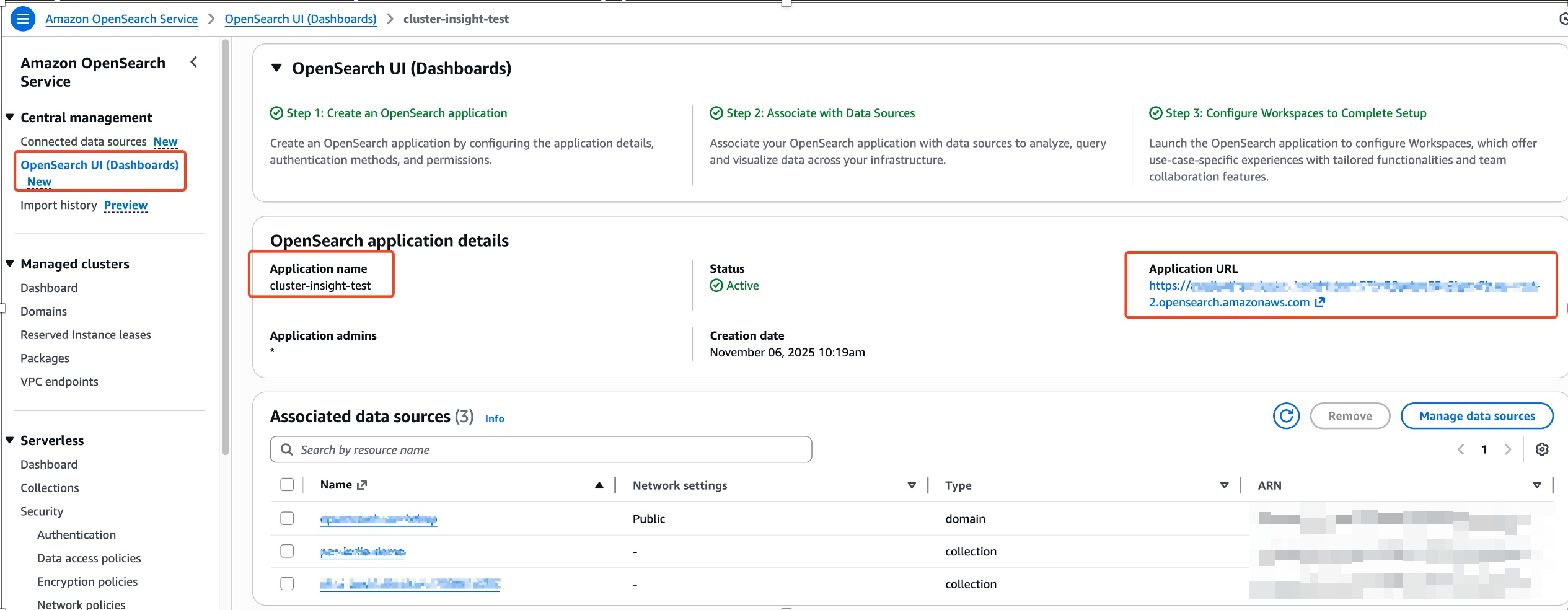 Cluster Insights は、OpenSearch バージョン 2.17 以降を実行している OpenSearch Service ユーザーに追加料金なしで利用できます。Cluster Insights にアクセスするには、OpenSearch ドメインの管理者レベルの権限が必要です。Cluster Insights は OpenSearch UI からのみ利用できます。OpenSearch UI は、複数のデータソースのサポート、ダッシュボードエクスペリエンスのゼロダウンタイムアップグレード、効果的なチームコラボレーションのためのキュレーションされたワークスペースを提供します。まず、データソース(クラスター)を OpenSearch UI アプリケーションに関連付ける必要があります。詳細な手順はユーザーガイドに記載されています。OpenSearch UI コンソールのエクスペリエンスは、以下のスクリーンショットのようになります。