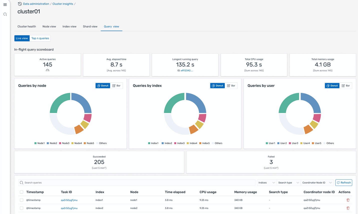Cluster insights ページの Query view は、すべてのクエリの実行統計、CPU とメモリの使用量、完了の進捗状況を分解するライブダッシュボードを提供します。これにより、最大のリソース消費を引き起こしているクエリ(上位 N 個のクエリ)を監視できます。ノード、インデックス、ユーザー別の分布を示す直感的なドーナツチャートとスコアボードにより、このインターフェースはオペレーターがパフォーマンスのボトルネックと重いワークロードを迅速に特定し、ターゲットを絞った最適化と自信を持ったスケーリングの決定をサポートします。