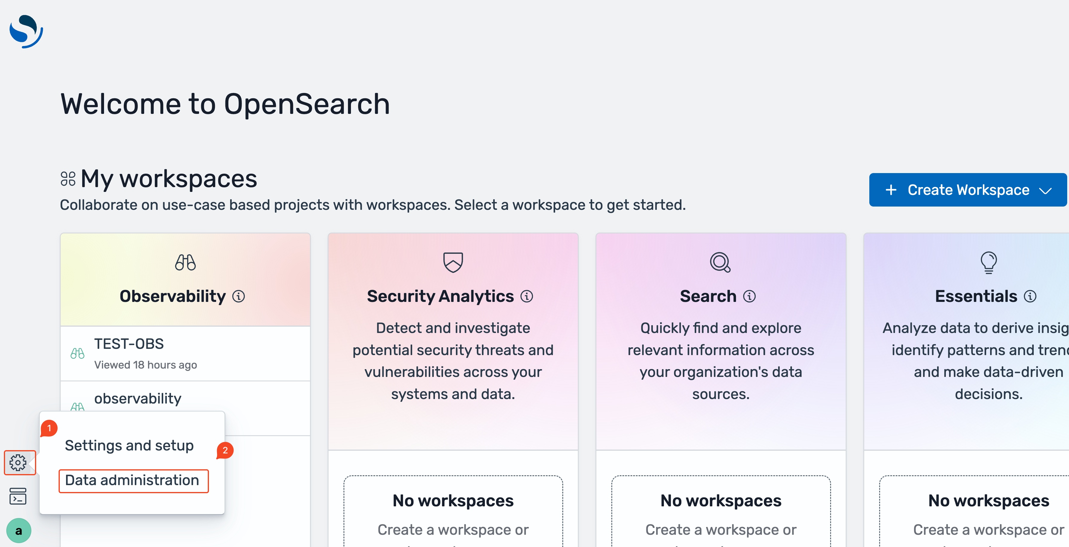 - OpenSearch UI アプリケーションで、左下隅の設定アイコンを選択し、Data administration を選択します。