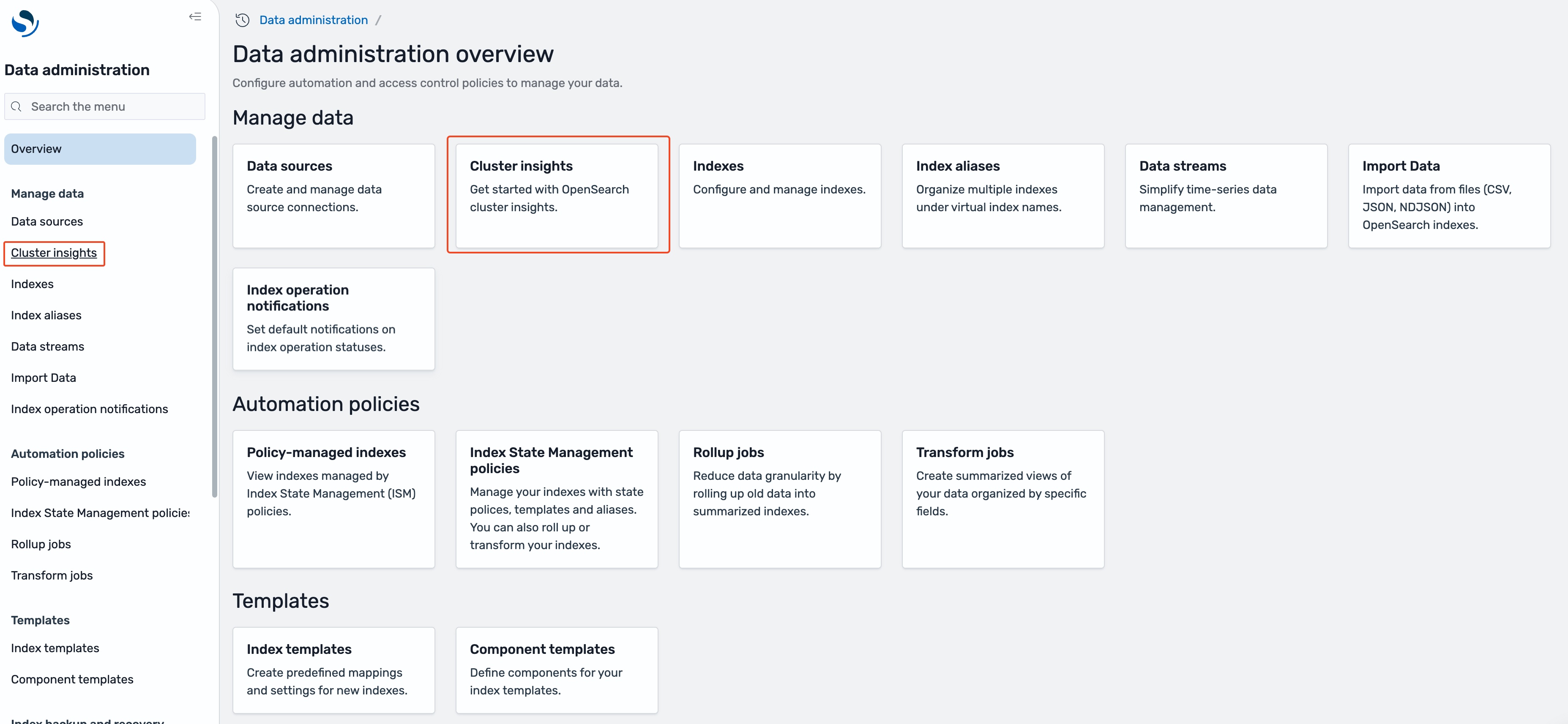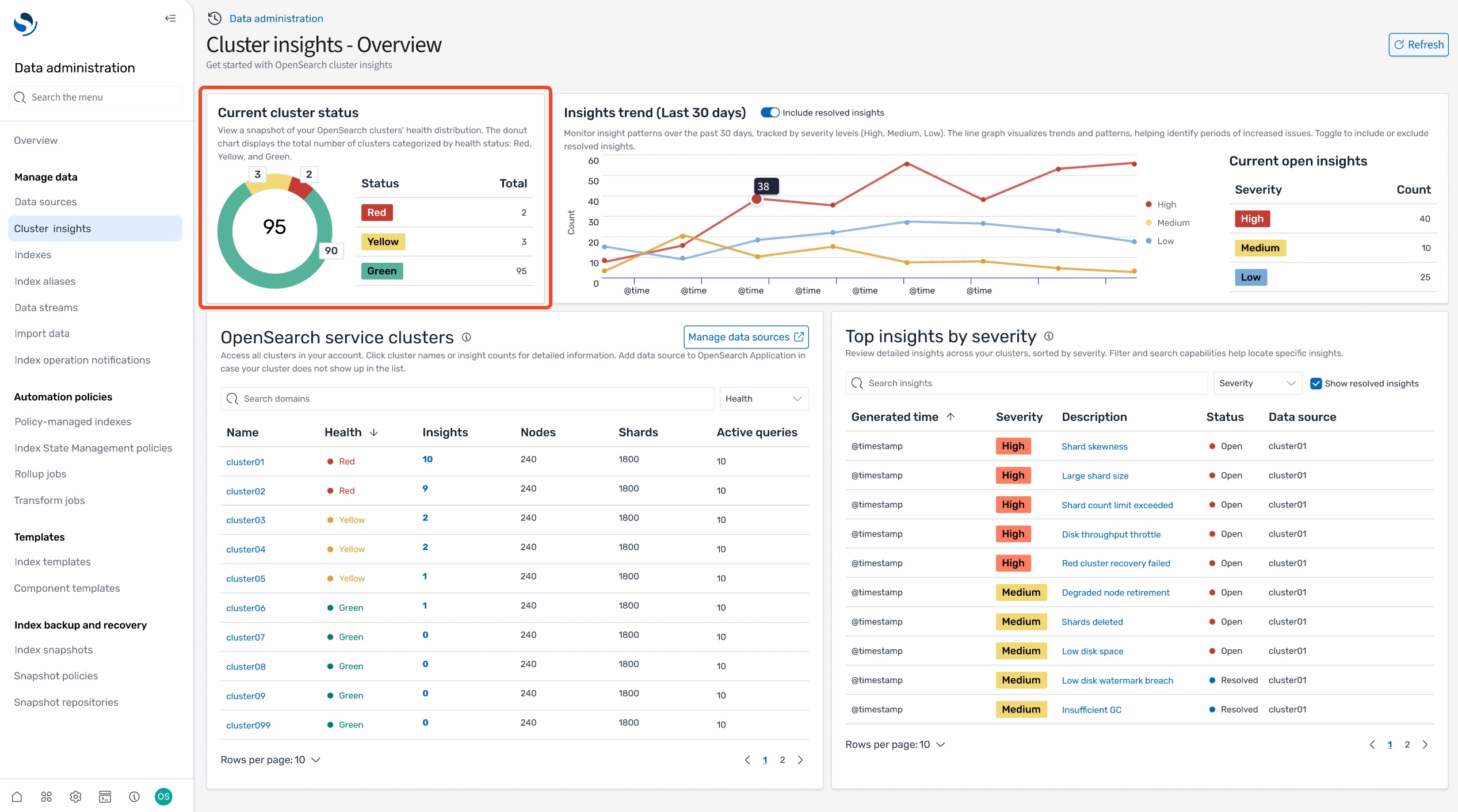 - Data administration overview ページ、または左側のナビゲーションの Manage data の下で、Cluster insights を選択します。