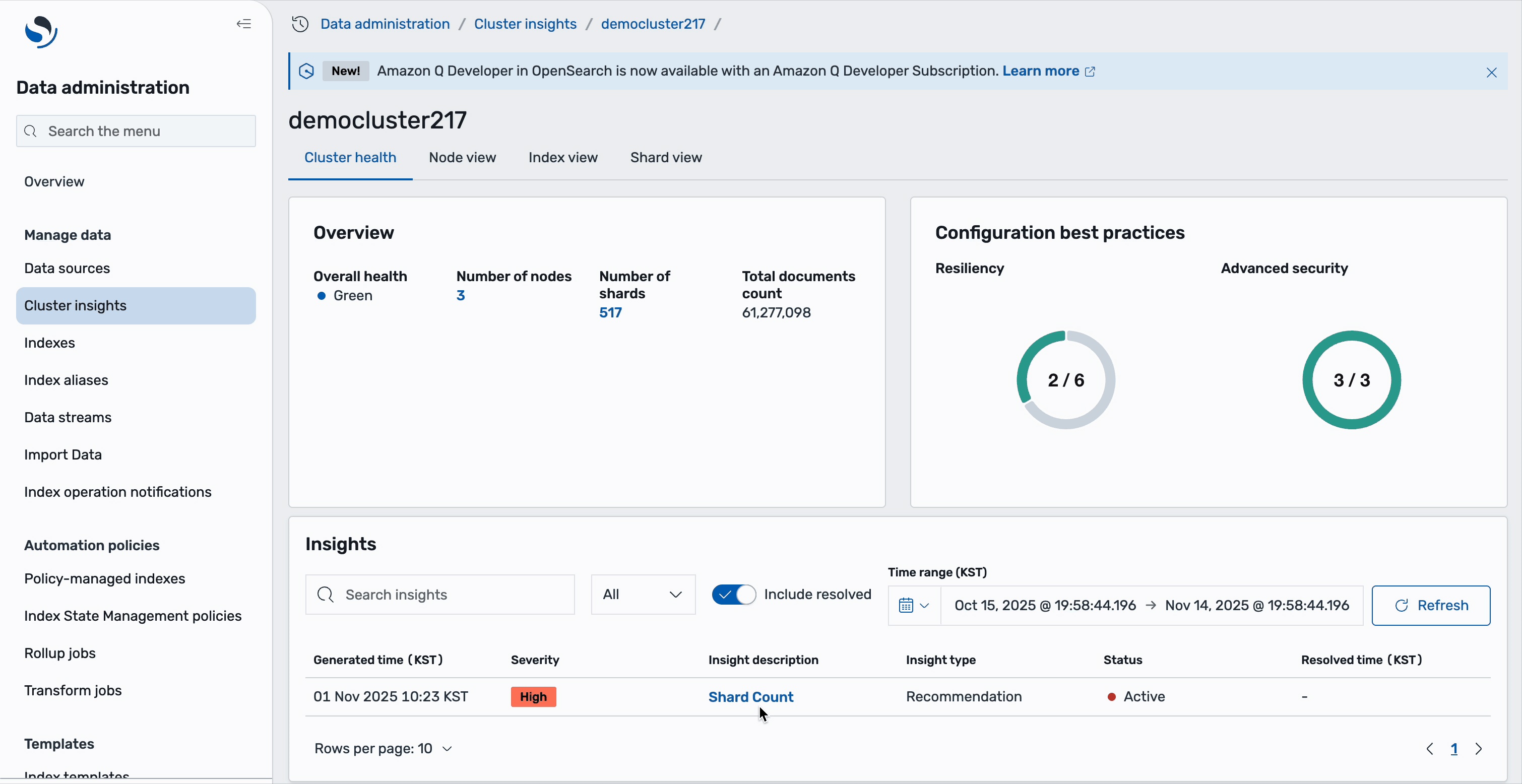 Cluster insights – Overview ページの OpenSearch ドメインから特定のクラスターを選択すると、健全性ステータス、アクティブなインサイト、パフォーマンスメトリクスを含むクラスター固有の詳細が表示されます。概要セクションには、シャード、ノード、インデックスの数、合計ドキュメントサイズなどの重要なメトリクスとともにクラスターの健全性が表示されます。また、回復力とセキュリティの領域全体でドメインが従っている設定のベストプラクティスを確認することもできます。
