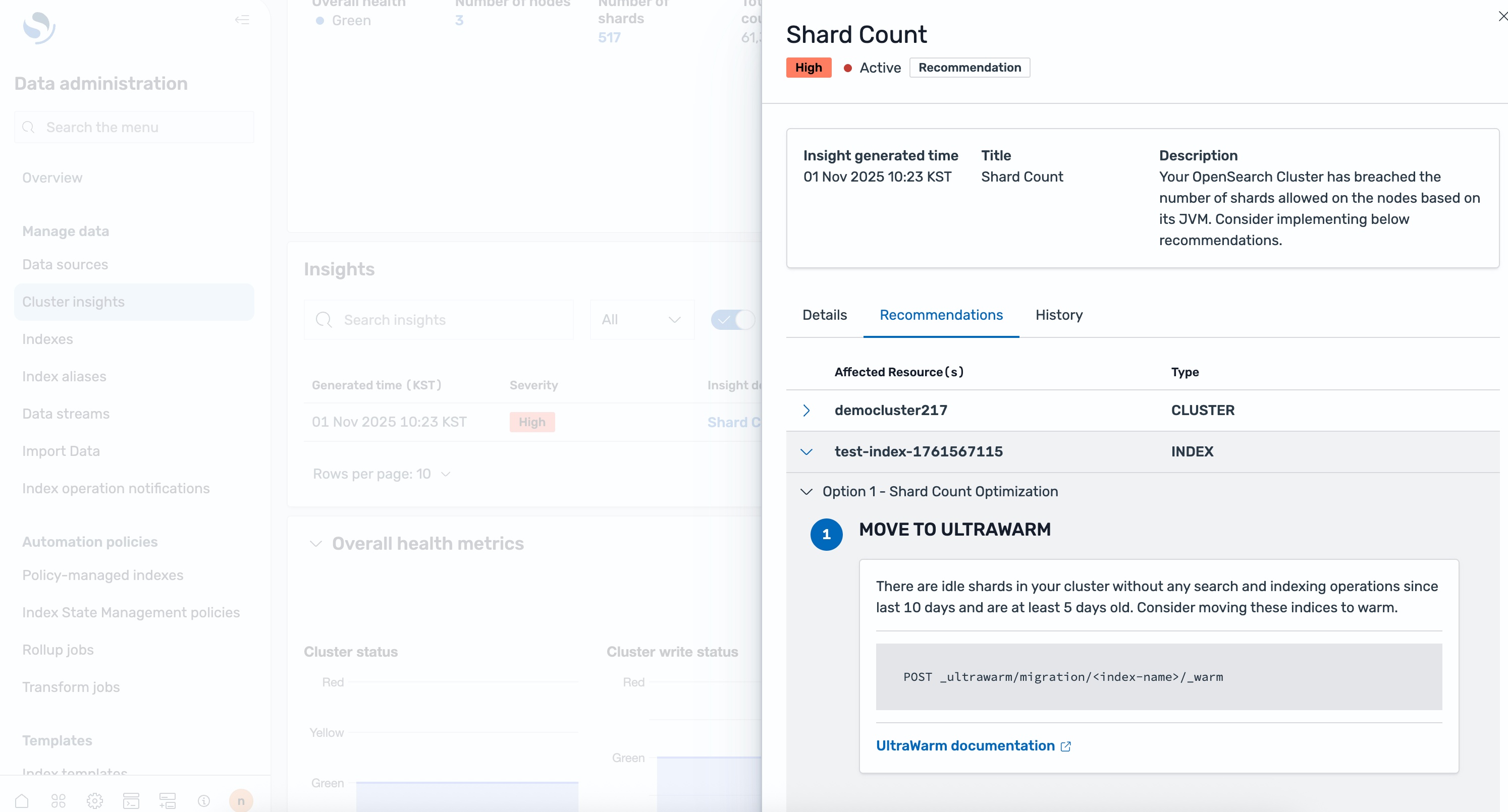 推奨事項は 2 つのレベルで整理されています。クラスターレベルの推奨事項は、クラスターのスケーリングやグローバルシャード割り当て設定の調整など、全体的なアーキテクチャの改善に対処します。インデックスレベルの推奨事項は、個々のインデックスに対する具体的なアクションを提供します。たとえば、アイドル状態のシャードを UltraWarm ストレージに移動する提案が表示される場合があります。これらは、過去 10 日間に検索またはインデックス作成操作がなく、少なくとも 5 日以上経過しているシャードであり、アクティブなシャード数を減らすためにウォームストレージに移動する理想的な候補です。このガイダンスはすべて Cluster Insights インターフェース内で直接利用でき、異なるツールやコンソール間を切り替える必要がありません。