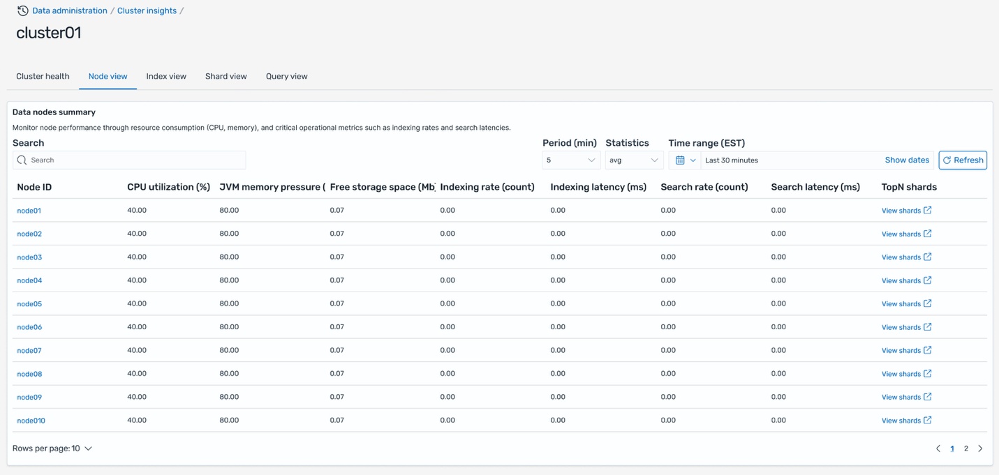 Node view タブは、クラスター全体の個々のノードのパフォーマンスの包括的なビューを提供します。このテーブルには、全体的なノードの健全性を示すヒートスコア、リソース使用率(CPU、メモリ、ディスク)、検索およびインデックスのレイテンシーとレート、各ノードで実行されている上位 N 個のシャードとクエリを表示するクイックリンクなど、各ノードの重要なメトリクスが表示されます。