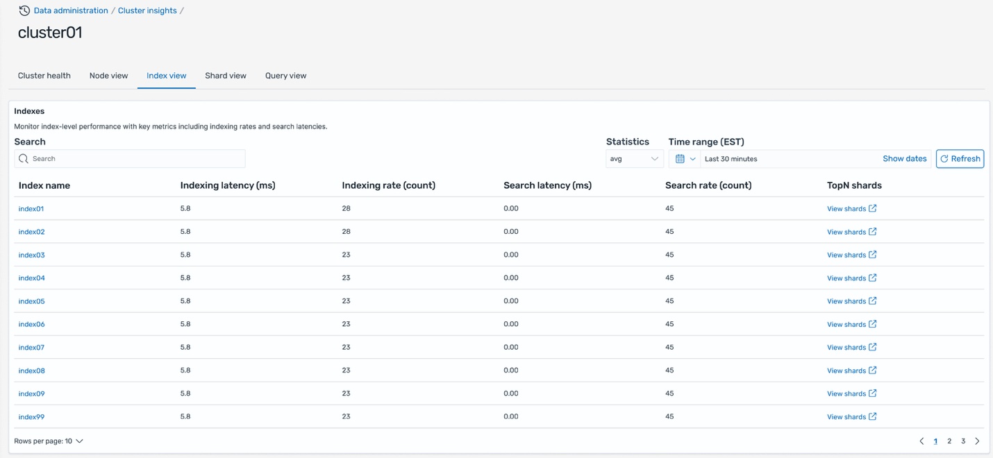 Index view タブは、インデックスレベルで集計されたパフォーマンスメトリクスを表示します。各インデックスについて、ドキュメント数とストレージサイズ、検索のレイテンシーとレート、インデックスのレイテンシーとレート、インデックスに影響を与える上位 N 個のクエリへのアクセスを監視できます。この視点は、どのインデックスがクラスターの負荷を引き起こしているかを理解し、インデックス設定レベルでの最適化の機会を特定するのに役立ちます。