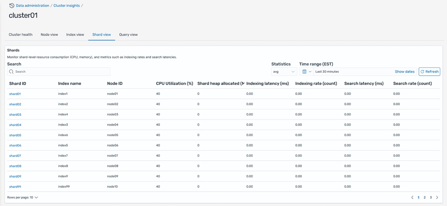 Shard view タブは、個々のシャードのメトリクスを表示することで、クラスターパフォーマンスの最も詳細なビューを提供します。各行には、シャード ID と割り当てられたノード、インデックスの関連付けとリソースプレッシャーメトリクス(CPU、メモリ)、シャードごとの検索およびインデックスのレイテンシーが表示されます。この詳細なビューにより、パフォーマンスの問題を引き起こしている特定のシャードを特定し、シャード配置の不均衡を識別し、ターゲットを絞った修復アクションを実行できます。